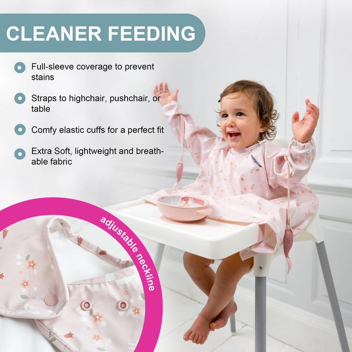 Adjustable neck and sleeves provide a snug, comfortable fit, keeping little ones happy and content during mealtimes.