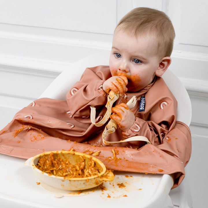 Our coverall feeding bibs are compatible with BIBaDO Handi Cutlery. It comes with ‘no drop’ straps, so you won’t have to pick up spoons & forks from the floor while your little one learns how to use them. (Handi Cutlery are sold separately)
