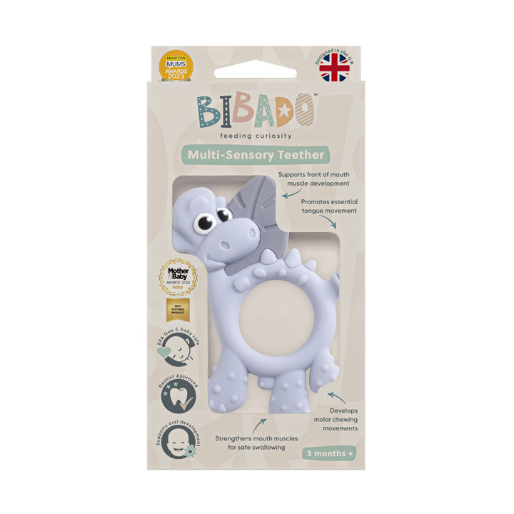 Dotty the Dinosaur is a Multi-Sensory Teether designed to strengthen and develop mouth muscles and help curious mouths unlock the secrets to biting and chewing.Designed by Bibado with teething and weaning...