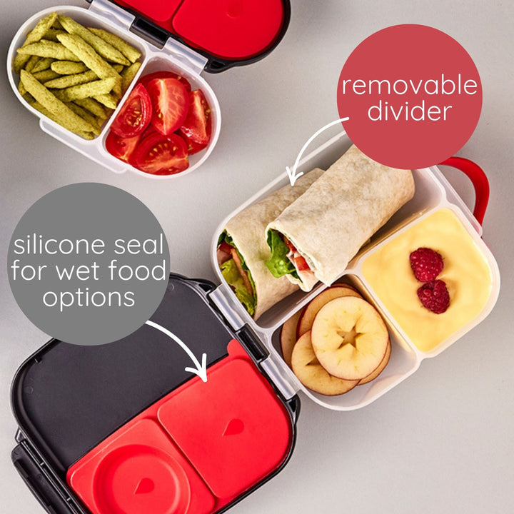 • 2 sealed compartments are leak proof securing wet foods such as puree, yoghurt and dips