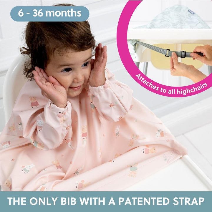 Adjustable patented straps attach to almost any high chair or pushchair, ensuring spill-catching coverage for clean and dry clothes during even the messiest meals.
