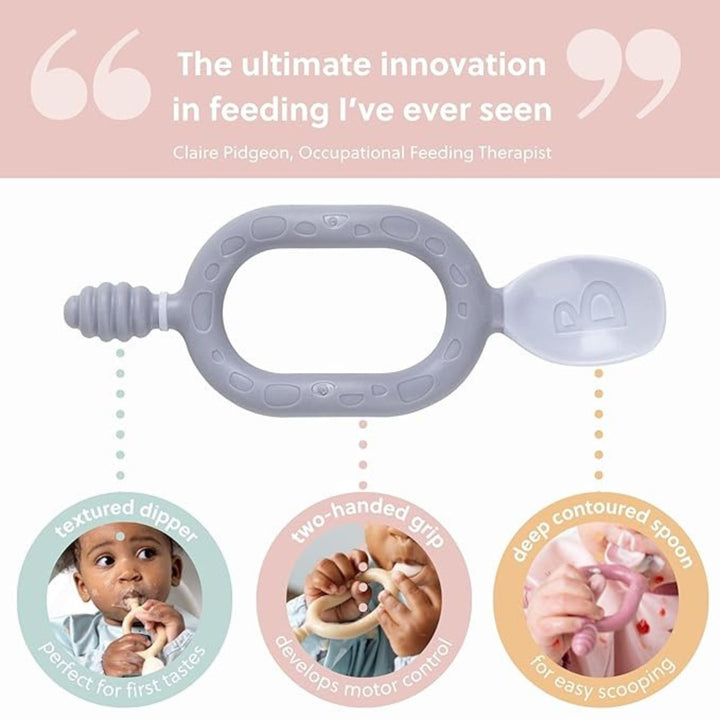 The dipper end is uniquely shaped to support their oral sensory development, and is perfect for yoghurts, porridge and purees, as well as soothing little gums.