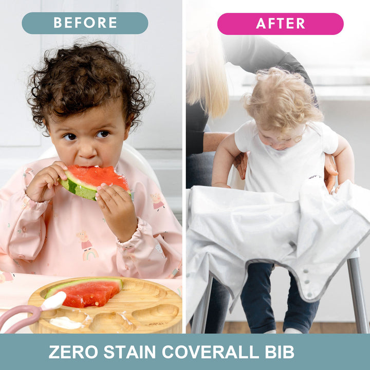 Introducing our amazing long sleeve feeding bibs for babies and toddlers by Bibado - the ultimate solution for mess-free mealtimes and worry-free weaning adventures! Tired of those traditional silicone bibs that always lead to messy clothes and endless clean-up? Look no further! Our bibs are designed to fit seamlessly on your highchair, making mealtime a breeze and keeping your little one perfectly clean and dry, even during the messiest meals or craft activities. Whether your highchair is wide, large, or doesn't have a tray, our coveralls work like a charm. Plus, they're incredibly versatile, fitting most strollers and can even be used directly on a table. You can trust us to deliver coveralls that guarantee mess-free meals both on the go and at home. Made from a unique, lightweight, and 100% waterproof material, our easy-wipe coverall weaning bibs are a piece of cake to clean after every messy adventure. Just give them a quick wipe, and they'll be good as new. For a more thorough cleaning, simply toss them in the washing machine at 40 degrees Celsius or 100 degrees Fahrenheit. But hold on, there's more!